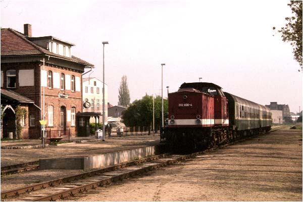 KBS 177: 202 666 steht mit der RB 15633 abfahrbereit im Bahnhof Dargun (18.05.96)