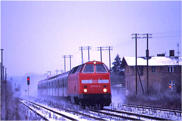 KBS 209.26: 219 009 passiert am frühen Morgen des 11.12.98 mit der RB 5911 in Ri. Polen den Bahnhof Seelow-Gusow ohne Halt Sensia/250/2.5 - 180 mm