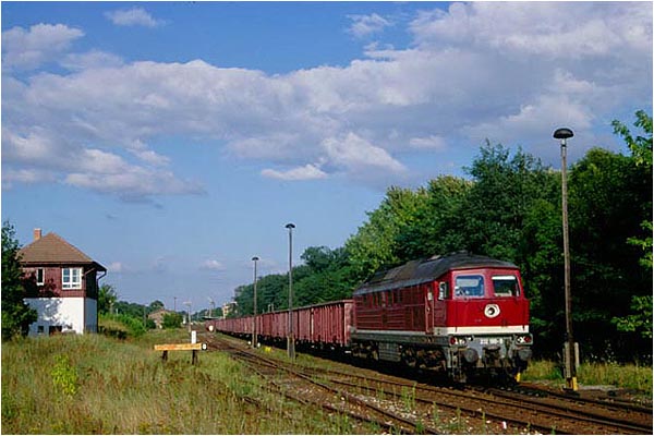 KBS 209.26: 232 190 verlässt mit einem Dg den Bahnhof Müncheberg (Mark) in Ri. Berlin (30.08.96)