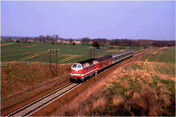 KBS 209.26: 219 112 mit RB 5822 in km 49,1 zwischen Obersdorf und Müncheberg (Mark) in Richtung Berlin (04.04.99)