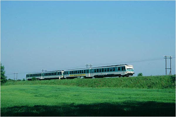 KBS 209.26: 628 635 und 628 642 als RB 5805 in km 48,6 zwischen Müncheberg (Mark) und Obersdorf in Richtung Küstrin-Kietz (01.06.96)