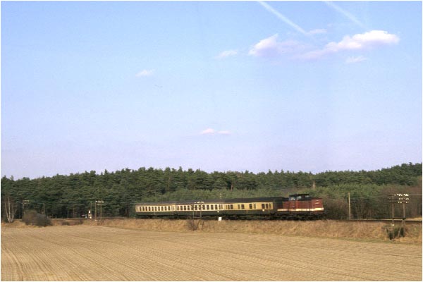 KBS 209.36: Eine 202 mit ihrem Zug in km 136,0 in Ri. Grunow (NL) zwischen Müllrose und Mixdorf (1997)