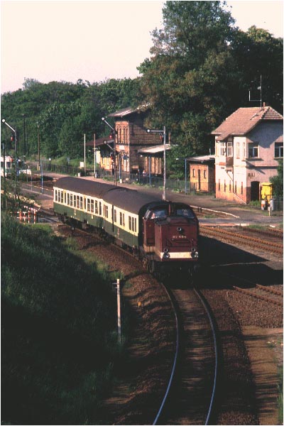 KBS 209.36: 202 519 verlässt mit ihrem Zug den Bahnhof Grunow (Niederlausitz) (31.05.96)
