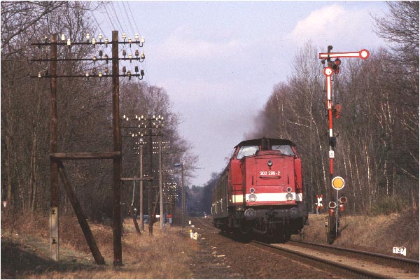 KBS 209.36: 202 295 passiert mit ihrem Zug in Ri. Grunow (NL) das Esig von Müllrose (1997)