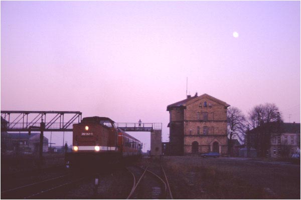 KBS 587: 202 841 verlässt mit der RB 96711 als vorletzter planmäßiger Zug im SPNV in Ri. Vitzenburg den Bahnhof Querfurt (30.12.98)